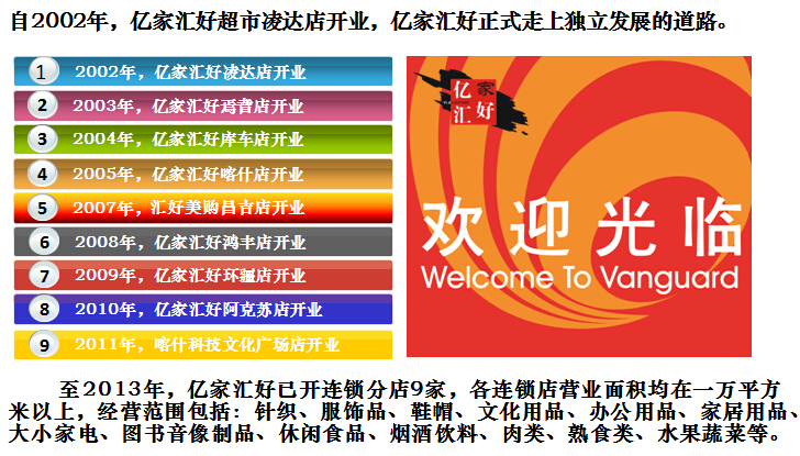 億家匯好商貿有限責任公司于2002年成立,并從臺灣引進連鎖經營職業(yè)管理團隊,統(tǒng)一管理旗下各地的連鎖超市。公司通過多年的穩(wěn)健發(fā)展,至2013年底,億家匯好商貿有限責任公司已成為擁有員工近3000多人,下轄一個配送中心和9家連鎖超市的大型綜合性零售企業(yè)??偨洜I面積11萬多平方米,配送中心輻射公司所有超市,年配送額可達2億元。公司大量吸納下崗職工,經過崗前培訓,提高勞動技能,實現了他們的再就業(yè),為維護社會和諧穩(wěn)定做出了貢獻。2013年,巴州億家匯好商貿有限責任公司在自治區(qū)零售業(yè)中穩(wěn)踞前三位,是自治區(qū)重要的流通龍頭企業(yè),2013年年銷售收入達10億人民幣。多年來,公司一直重管理、抓實效、運用先進的管理手段和營銷理念,秉承億家匯好人 時時尋求效率創(chuàng)新,事事講究專業(yè)技術的文化精髓,創(chuàng)造了良好的經濟效益和社會效益。公司先后多次被消費者協(xié)會評為誠信單位,并多年被評為重合同,守信用單位。